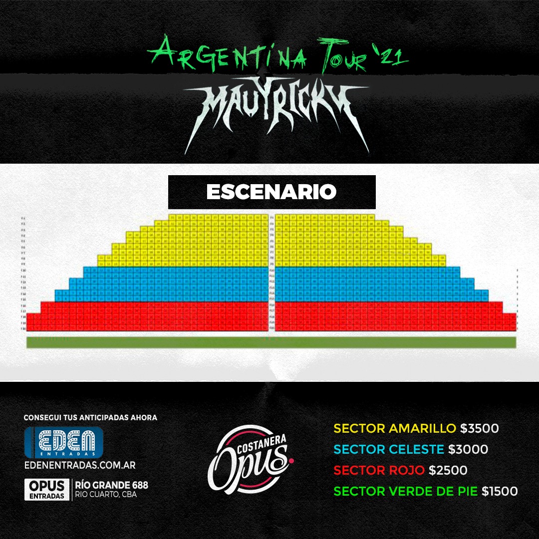 MAU Y RICKY domingo 12/12 21:00 Hs $1500 - $2500 - $3000 - $3500 MAU Y RICKY ARGENTINA TOUR ’21 Única función 12 de diciembre Para obtener tus tickets visitanos en nuestras boleterías a partir de las 17 hs hasta las 20 hs Sabias que podés pagar los tickets de todos nuestros shows con todas las tarjeta de crédito ?? Para realizar tus consultas podés escribirnos al 358 570-7662 En Río Grande 688 (Opus Costanera) Venta online a través de https://www.edenentradas.com.ar/sitio/contenido/evento?ce=SHOW005802 Recordá que los tickets son limitados Sector de pie $1500 Sector rojo $2500 Sector celeste $3000 Sector amarillo $3500 Lugar: Opus Costanera FacebookTwitterGoogle+PinterestE-mail